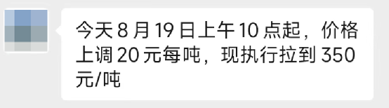 另一家河南企業(yè)通知,8月19日上午10時(shí)起,價(jià)格上調(diào)20元/噸。執(zhí)行到位價(jià)350元/噸。