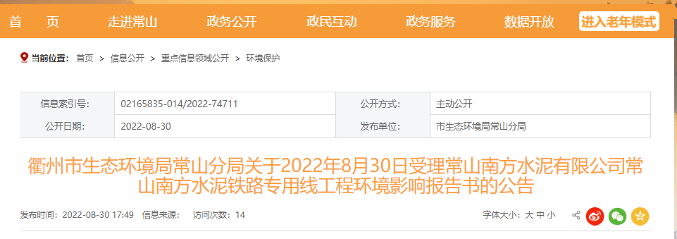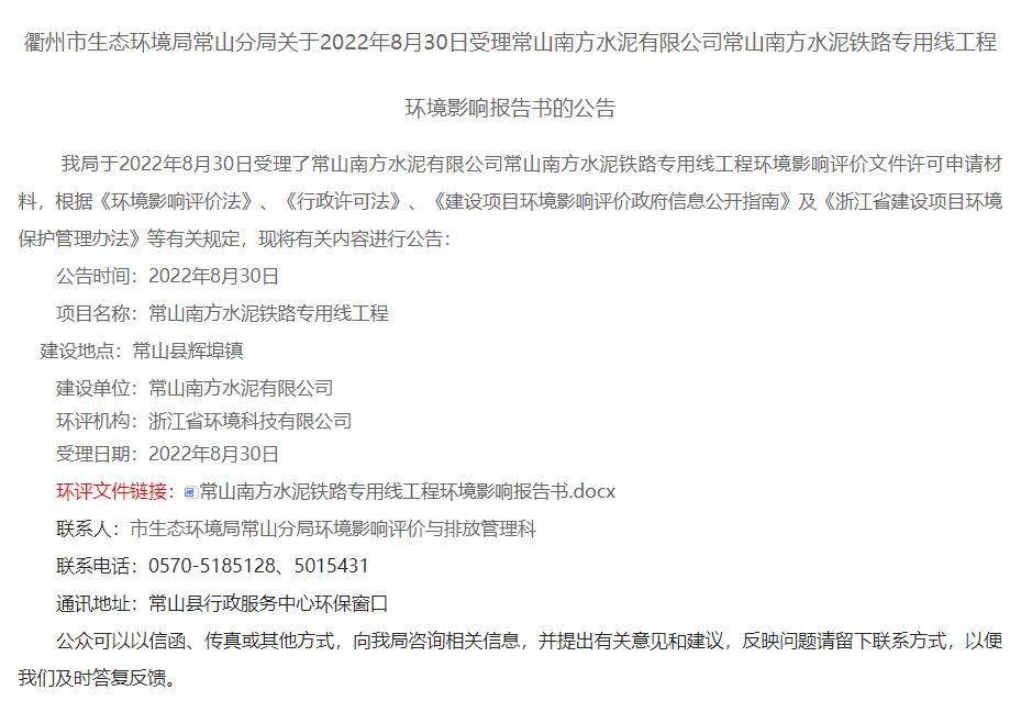 浙江省衢州市生態(tài)環(huán)境局常山分局發(fā)布《關(guān)于2022年8月30日受理常山南方水泥有限公司常山南方水泥鐵路專用線工程環(huán)境影響報告書的公告》