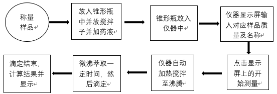 稱量一定量的樣品,將其倒入150ml錐形瓶中,加上30ml的乙二醇-無水乙醇溶液,放入攪拌子,然后放入儀器中對(duì)應(yīng)位置,裝上冷凝管,使得錐形瓶與冷凝管緊密連接,在儀器顯示屏對(duì)應(yīng)的位置輸入稱取的樣品質(zhì)量及樣品名稱,點(diǎn)擊開始測(cè)量,儀器會(huì)自動(dòng)進(jìn)行攪拌、加熱、萃取、滴定及結(jié)果計(jì)算,如圖2。
