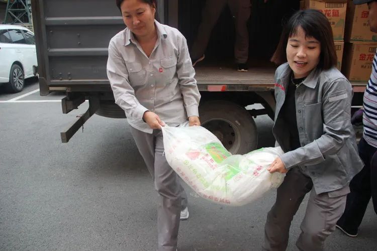 工會(huì)主席袁康林興奮的為員工裝魚,“快來,袋子接好嘍,魚要跑了!”大家圍在一起,歡快的笑聲在職工食堂回蕩。