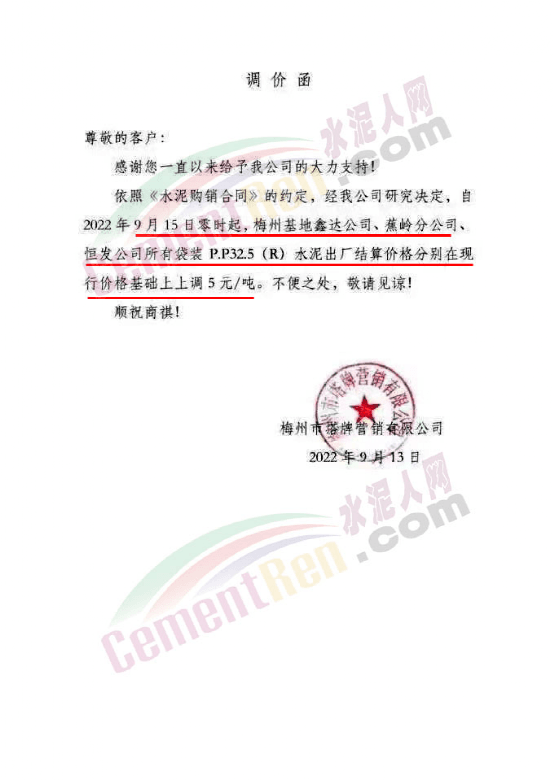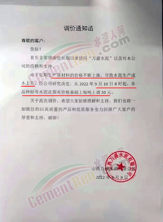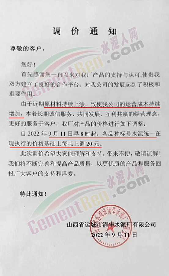 山西運(yùn)城市清華水泥通知,由于近期原材料持續(xù)上漲,致使公司運(yùn)營成本持續(xù)增加,自9月11日早8時(shí)起,各品種標(biāo)號水泥統(tǒng)一在現(xiàn)執(zhí)行價(jià)格基礎(chǔ)上上調(diào)20元/噸。