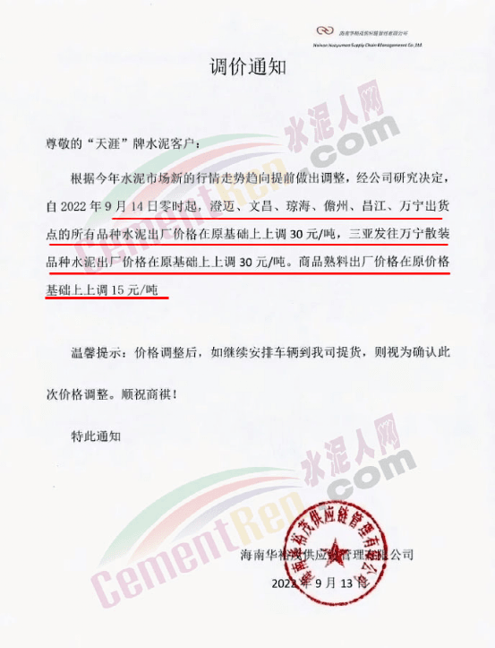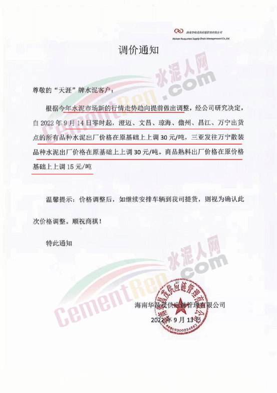 海南華昌茂供應(yīng)鏈管理有限公司、海南華裕茂供應(yīng)鏈管理有限公司通知,根據(jù)今年水泥市場新的行情走勢趨向提前做出調(diào)整,經(jīng)公司研究決定,自2022年9月14日零時(shí)起,澄邁、文昌、瓊海、儋州、昌江、萬寧出貨點(diǎn)的所有品種水泥出廠價(jià)格在原基礎(chǔ)上上調(diào)30元/噸,三亞發(fā)往萬寧散裝品種水泥出廠價(jià)格在原基礎(chǔ)上上調(diào)30元/噸。商品熟料出廠價(jià)格在原價(jià)格基礎(chǔ)上上調(diào)15元/噸。