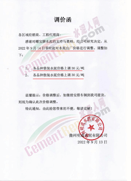 儋州明成水泥有限公司通知,自9月14日零時(shí)起對水泥出廠價(jià)格上調(diào)30元/噸。價(jià)格調(diào)整后,如繼續(xù)安排車輛到公司提貨,則視為確認(rèn)此次價(jià)格調(diào)整。
