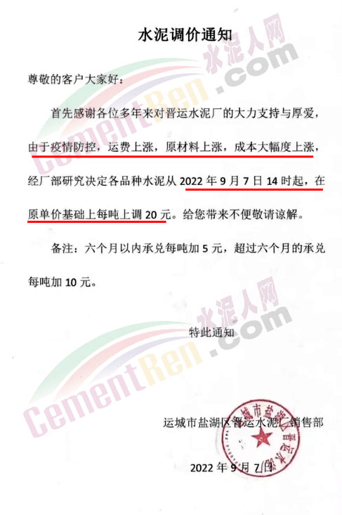運(yùn)城市鹽湖區(qū)晉運(yùn)水泥銷售部通知,由于疫情防控、運(yùn)費(fèi)上漲、原材料上漲、成本大幅度上漲,從9月7日14時(shí)起,在原價(jià)基礎(chǔ)上上調(diào)20元/噸。