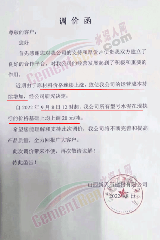 山西新天石建材有限公司通知,由于原材料價(jià)格連續(xù)上漲,致使公司運(yùn)營成本持續(xù)增加,自9月8日12時(shí)起,公司所有型號水泥在現(xiàn)執(zhí)行價(jià)格基礎(chǔ)上上調(diào)20元/噸。