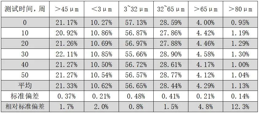 長(zhǎng)時(shí)間連續(xù)的工作,對(duì)在線系統(tǒng)的防污染及自清潔能力提出了很高的要求,歐美克在線系統(tǒng)通過(guò)風(fēng)刀反向增壓紊流自動(dòng)清洗技術(shù)顯著延長(zhǎng)了系統(tǒng)的免人工維護(hù)時(shí)間。相較于傳統(tǒng)順序壓力梯度清洗方式,歐美克在線系統(tǒng)的窗口自潔能力得到了極大地提高,顯著地降低了人工手動(dòng)清洗測(cè)試窗口的頻度,同時(shí)保障了測(cè)試結(jié)果始終可靠!以某品牌的PO42.5水泥樣品為例,在風(fēng)刀自動(dòng)清洗維護(hù)下,系統(tǒng)無(wú)人干預(yù)連續(xù)工作3個(gè)月以上,45um余量、3-32um含量、32-65um含量、小于3um含量皆能保持良好的重現(xiàn)性,且無(wú)趨勢(shì)性偏移。在此案例中,無(wú)人干預(yù)連續(xù)工作超過(guò)3個(gè)月,以上含量連續(xù)監(jiān)控相對(duì)標(biāo)準(zhǔn)偏差均在2%以?xún)?nèi)。