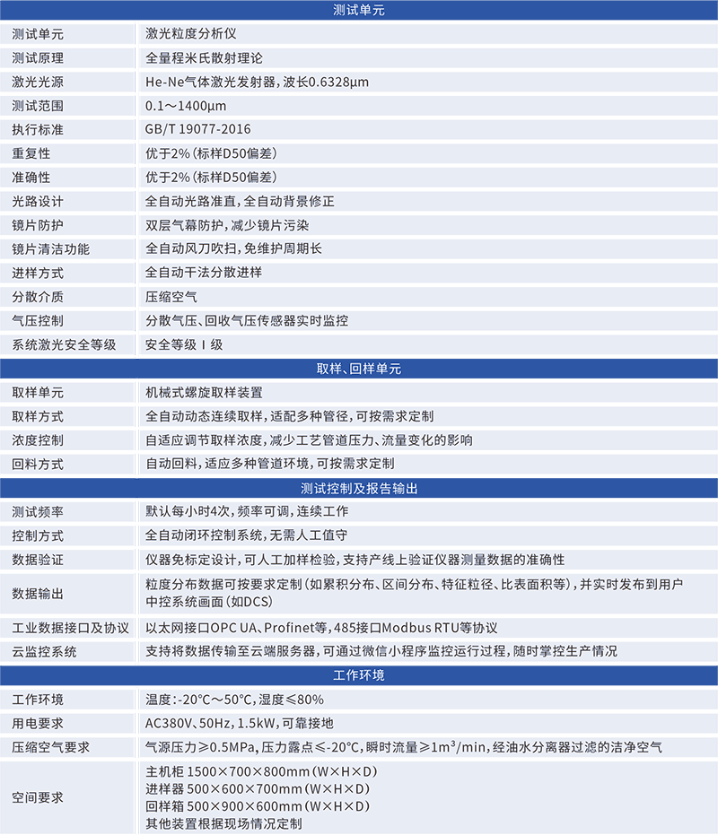 隨著粉體工業(yè)智能化生產(chǎn)(工業(yè)4.0)和減碳等發(fā)展需求,作為粉體材料加工中關(guān)鍵質(zhì)量表征的粒度信息的在線檢測(cè)需求越來(lái)越強(qiáng)烈。良好的產(chǎn)線實(shí)時(shí)粒度測(cè)量可以及時(shí)根據(jù)物料信息調(diào)整產(chǎn)線參數(shù),使生產(chǎn)物料質(zhì)量一致性更高,也有利于多因素復(fù)雜生產(chǎn)事件的確認(rèn)、管理和追溯,及時(shí)發(fā)現(xiàn)產(chǎn)線設(shè)備異常,降低生產(chǎn)中斷和設(shè)備故障的風(fēng)險(xiǎn)。全自動(dòng)的在線測(cè)試可以節(jié)省人工,自動(dòng)將分析結(jié)果傳輸至產(chǎn)線智能中控平臺(tái),結(jié)合多種智能化數(shù)據(jù)進(jìn)行綜合評(píng)判和生產(chǎn)過(guò)程優(yōu)化。對(duì)于產(chǎn)線的轉(zhuǎn)產(chǎn)亦可以快速響應(yīng),縮短產(chǎn)線調(diào)整時(shí)間,減少物料和能源的浪費(fèi)和產(chǎn)線的損耗。