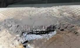 2、輥套母體表層崩損,輥壓機(jī)系統(tǒng)運(yùn)行中使用除鐵裝置已成標(biāo)配,不可否認(rèn)的是部分企業(yè)在生產(chǎn)運(yùn)行中該設(shè)備形同擺設(shè)也是存在的,而系統(tǒng)中進(jìn)入不吸磁鐵件也為常事,因輥套母體為鍛造而成,整體強(qiáng)度稍顯不足,很容易在進(jìn)入鐵體時(shí)將母材表層崩損,如不及時(shí)修復(fù)短時(shí)間內(nèi)會(huì)使崩損點(diǎn)像堆焊輥套那樣造成往深處磨損及周邊擴(kuò)展的問題發(fā)生。