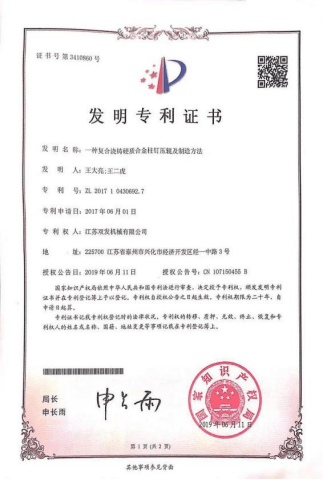 鑄釘合金輥套發(fā)明專利證書: