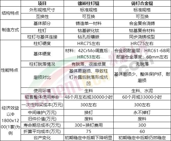 鑲嵌式柱釘輥與鑄釘輥數(shù)據(jù)對(duì)比:
