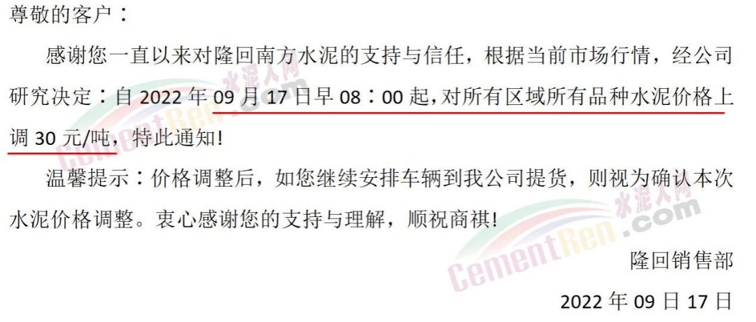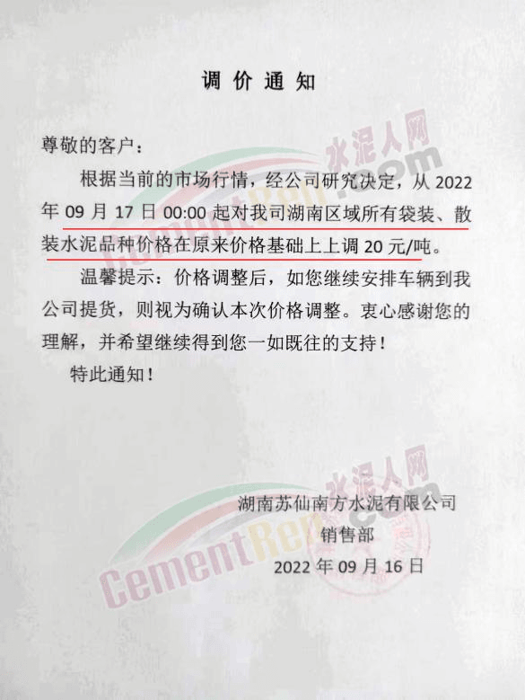 湖南寧鄉(xiāng)南方水泥有限公司銷售部通知根據(jù)當(dāng)前市場行情及原材料成本上漲等情況,經(jīng)公司研究決定自2022 年9月20日0時起,對各區(qū)域、各品種的水泥出廠價在原基礎(chǔ)上整體上調(diào)50元/噸。