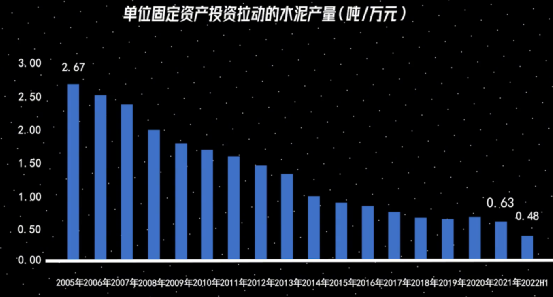 這一結(jié)論我們可以用一個(gè)指標(biāo)來驗(yàn)證,單位固定投資產(chǎn)投資拉動(dòng)的水泥產(chǎn)量。從歷史數(shù)據(jù)來看,每萬元固定資產(chǎn)投資需要的水泥量,已經(jīng)從2005年的2.67噸下降至2021年的0.63噸。并且2022年上半年繼續(xù)下滑至0.48噸,這一遞減規(guī)律也是符合常理的。
