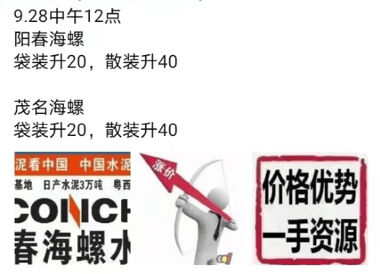海螺水泥經(jīng)銷商打款群里通知調(diào)價的信息是在8點17分,通知是自8點起上調(diào)40-50元/噸。前一日司機群里的通知是“25日8時上調(diào)50元/噸,后經(jīng)研討決定,改為26日8點各品種上調(diào)30元/噸。”