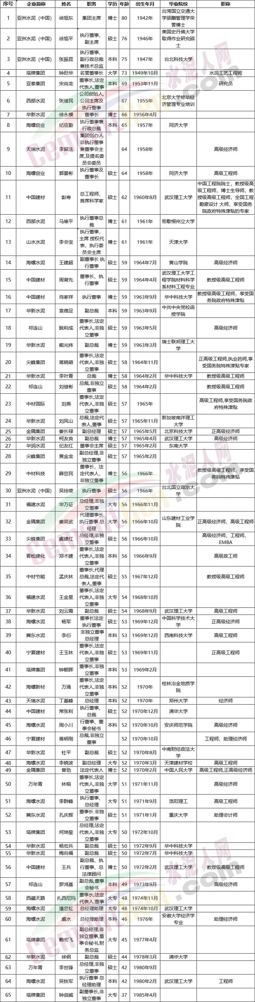 上市公司數(shù)據(jù)庫高管簡歷顯示,水泥行業(yè)上市公司管理層董事長、總經(jīng)理、總裁、副總裁等65位高管中13位已年過六旬,其中四位年過七旬。其中: