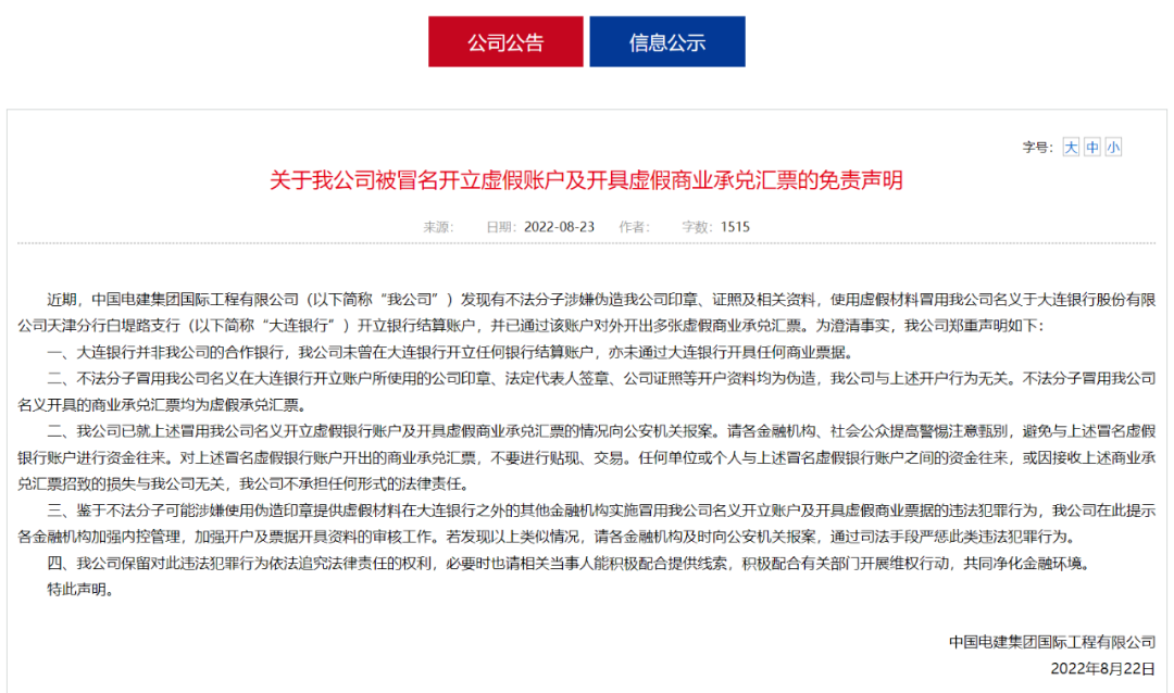 前不久,中國電建集團(tuán)國際工程有限公司發(fā)布《關(guān)于我公司被冒名開立虛假賬戶及開具虛假商業(yè)承兌匯票的免責(zé)聲明》稱:發(fā)現(xiàn)有不法分子涉嫌偽造公司印章、證照及相關(guān)資料,使用虛假材料冒用公司名義于銀行開立結(jié)算賬戶,并已通過該賬戶對(duì)外開出多張?zhí)摷偕虡I(yè)承兌匯票。