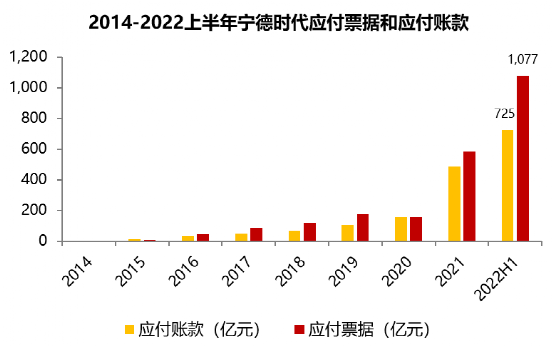 面對(duì)營業(yè)成本的快速上升和不斷擴(kuò)大的產(chǎn)能,寧德時(shí)代資金支付需求快速上升。企業(yè)對(duì)供應(yīng)商的欠款一般在資產(chǎn)負(fù)債表中計(jì)入應(yīng)付賬款和應(yīng)付票據(jù)項(xiàng)目中,寧德時(shí)代2012-2022上半年應(yīng)付賬款和應(yīng)付票據(jù)變化情況如下: