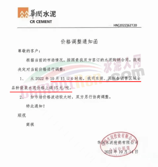 華潤水泥投資有限公司通知10月14日0時起,公司中山、珠海、江門各銷售區(qū)域散裝水泥價格上調10元噸。15日0時起,公司東莞、深圳各銷售區(qū)域全品種袋裝水泥上調15元/噸。