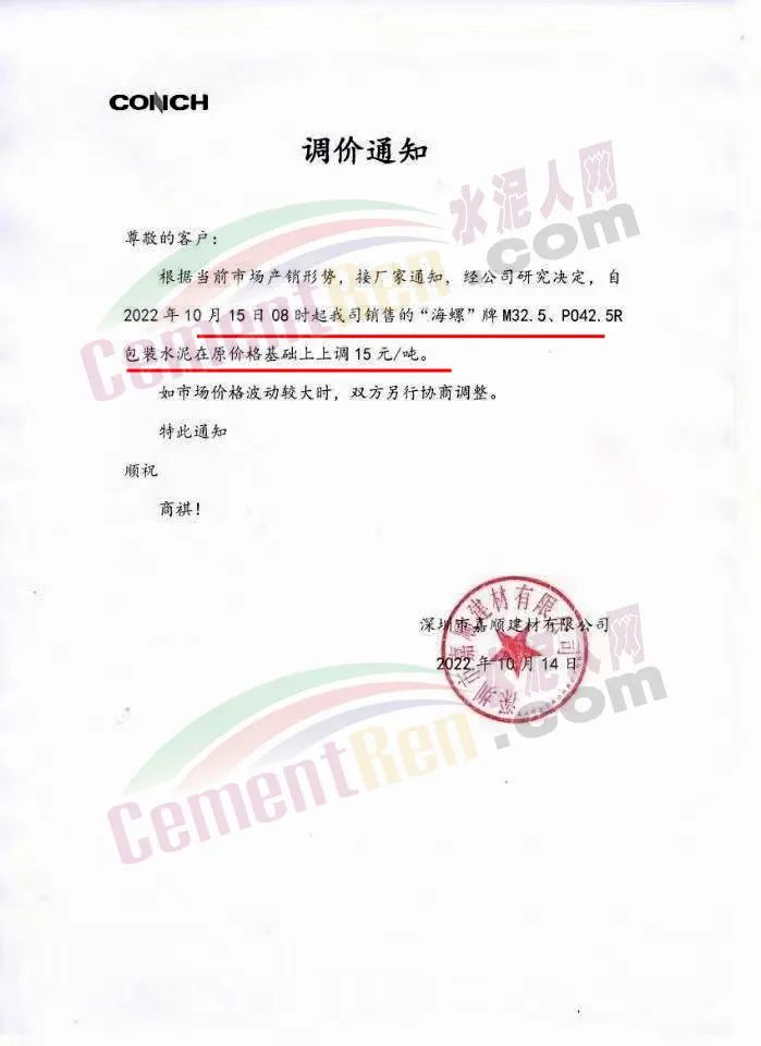 深圳市嘉順建材有限公司通知10月15日8時起公司銷售的“海螺”牌M32.5、P.O42.5R包裝水泥在原價基礎上上調15元/噸。