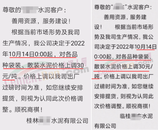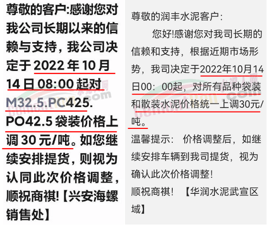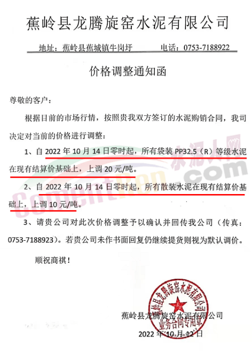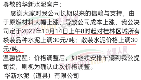華新水泥(道縣)有限公司通知,由于原燃材料大幅上漲,導致公司成本上漲,公司定于2022年10月14日上午8時起對桂林區(qū)域所有袋裝品種水泥上調30元/噸;散裝水泥價格上調30 元/噸。