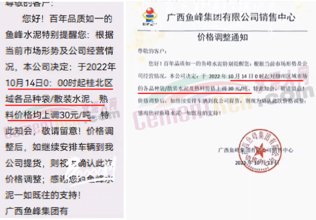 廣西區(qū)域包括海螺、華潤、華新、魚峰、虎鷹水泥在內的多家品牌水泥通知于10月14日起,對各品種袋裝、散裝水泥價格上調30元/噸。