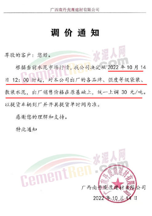 廣西虎鷹水泥有限公司通知10月14日0時起,各品種各標號水泥上調30元/噸。