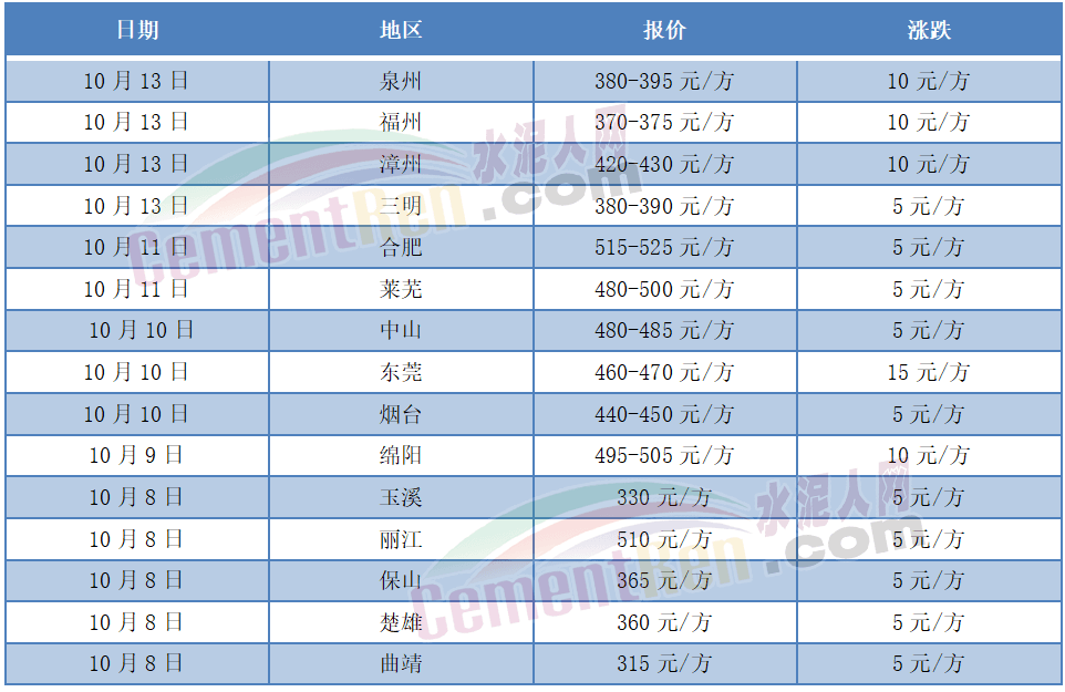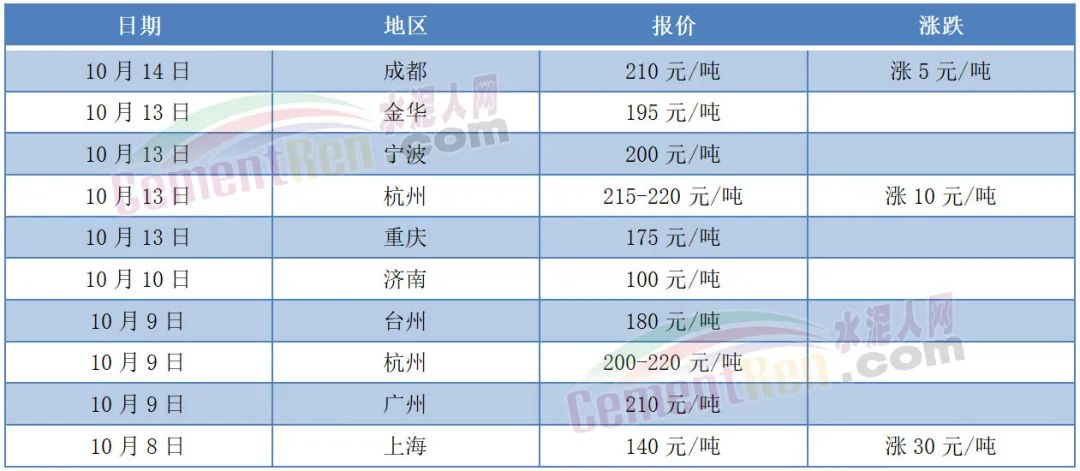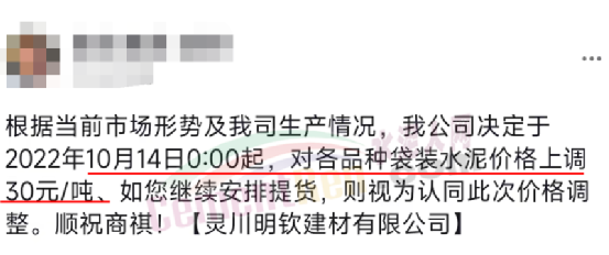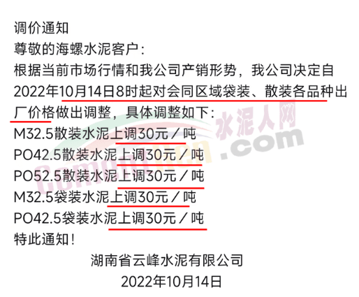 海螺水泥旗下云峰水泥通知,10月14日8時起,各標號水泥上調30元/噸。