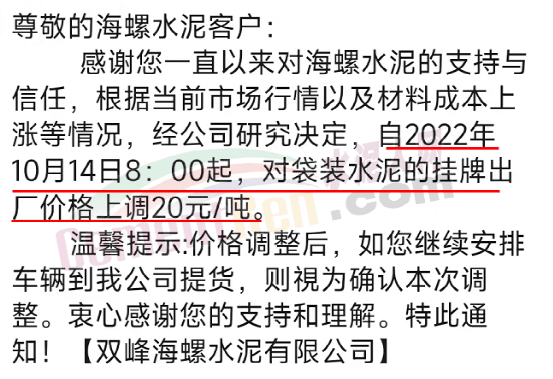 湖南雙峰海螺水泥通知自10月14日8時起,對袋裝水泥掛牌出廠價上調20元/噸。