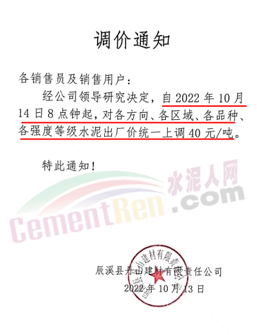 湖南懷化辰溪丹山建材有限公司通知 10月14日8時起,對各方向、各區(qū)域、各品種、各強度等級水泥出廠價上調40元/噸。