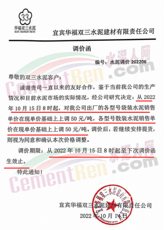 四川賓華福三雙水泥建材有限公司通知,從10月15日8時起,各標號水泥報價上調50元/噸。
