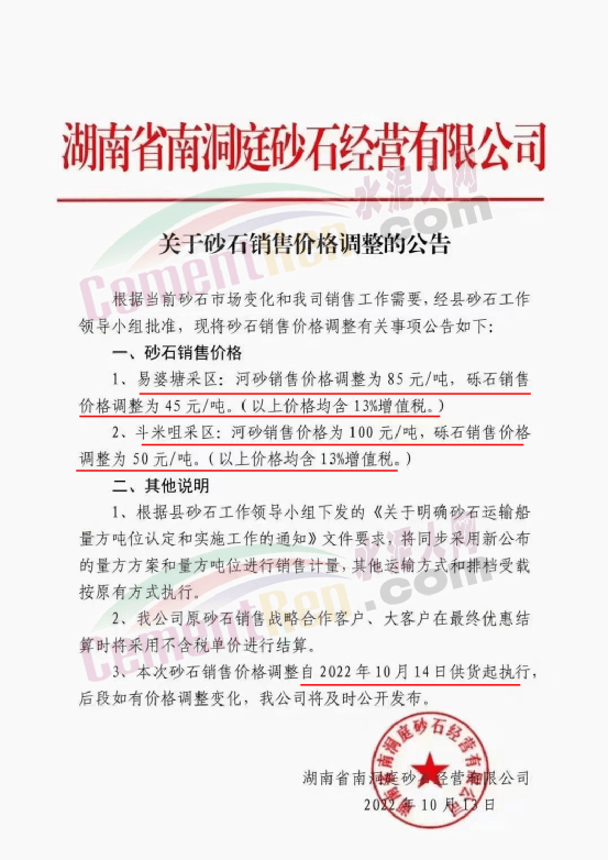 日前,湖南省南洞庭砂石經營有限公司發(fā)布《關于砂石銷售價格調整的公告》稱,根據當前砂石市場變化和我司銷售工作需要,經縣砂石工作領導小組批準,自2022年10月14日起,易婆塘采區(qū)河砂銷售價格調整為85元/噸,礫石銷售價格調整為45元/噸。斗米咀采區(qū)河砂銷售價格為100元/噸,礫石銷售價格調整為50元/噸,(以上價格均含13%增值稅)。