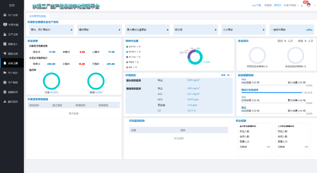 該系統(tǒng)建成后,河南錦榮水泥通過(guò)一體化管理平臺(tái)有效提高了生產(chǎn)過(guò)程管控精細(xì)化、專業(yè)化和智能化,實(shí)現(xiàn)了生產(chǎn)節(jié)能降耗、減員增效、自主決策、管理創(chuàng)新、安全可靠、降本提效的目標(biāo),大大降低了人員作業(yè)的風(fēng)險(xiǎn)。同時(shí)通過(guò)安環(huán)管理系統(tǒng)結(jié)合智能視頻分析系統(tǒng),對(duì)違規(guī)作業(yè)、危險(xiǎn)源、消防系統(tǒng)、環(huán)保排放數(shù)據(jù)及環(huán)境監(jiān)測(cè)數(shù)據(jù)進(jìn)行了實(shí)時(shí)展示和預(yù)警報(bào)警。在安全生產(chǎn)風(fēng)險(xiǎn)識(shí)別管控和隱患排查治理等方面實(shí)現(xiàn)了閉環(huán)管理,促進(jìn)了安全生產(chǎn)形勢(shì)穩(wěn)定好轉(zhuǎn)。河南錦榮水泥安全智能化管理模式得到當(dāng)?shù)匕脖O(jiān)部門高度重視和認(rèn)可。