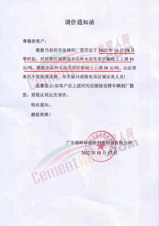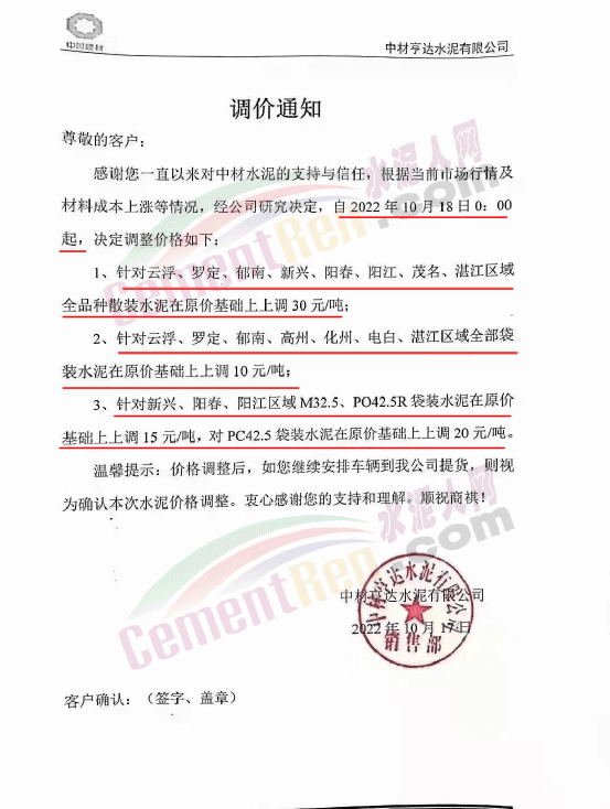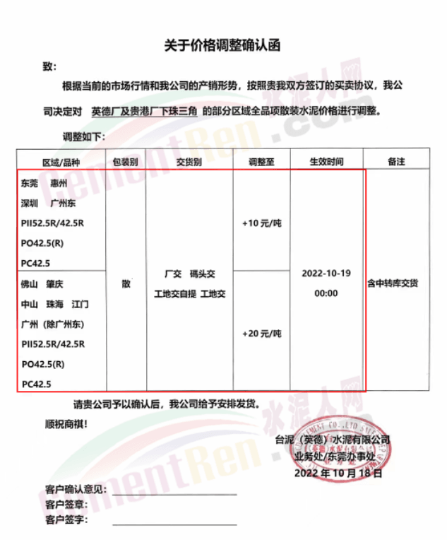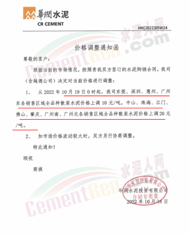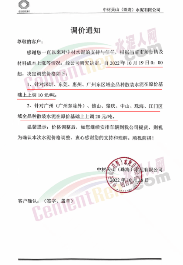 與此同時,珠三角區(qū)域中材天山、中材亨達(dá)、華潤水泥、臺泥水泥、塔 牌水泥、光大水泥、青洲水泥等水泥企業(yè)通知上調(diào)水泥價格10-30元/噸,下游商混企業(yè)紛紛跟進(jìn)。