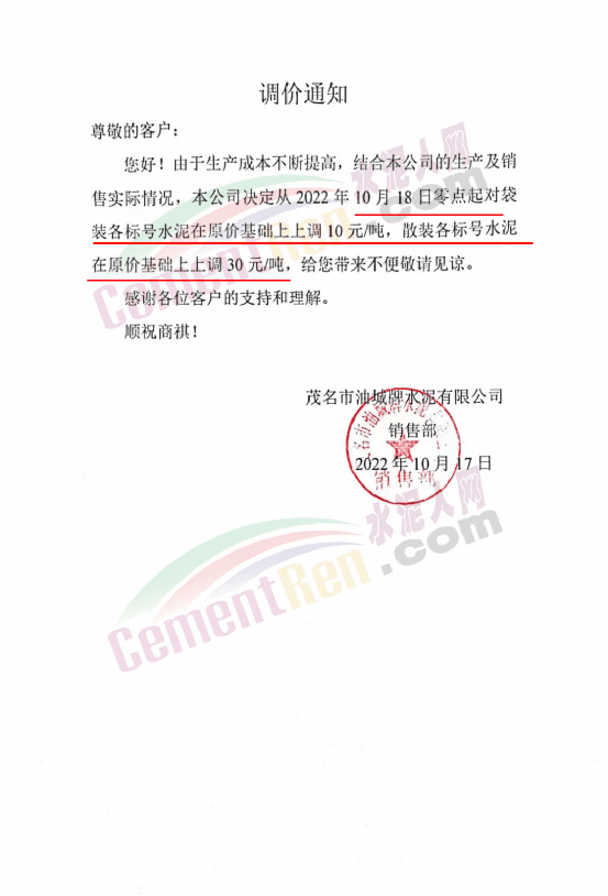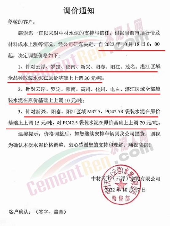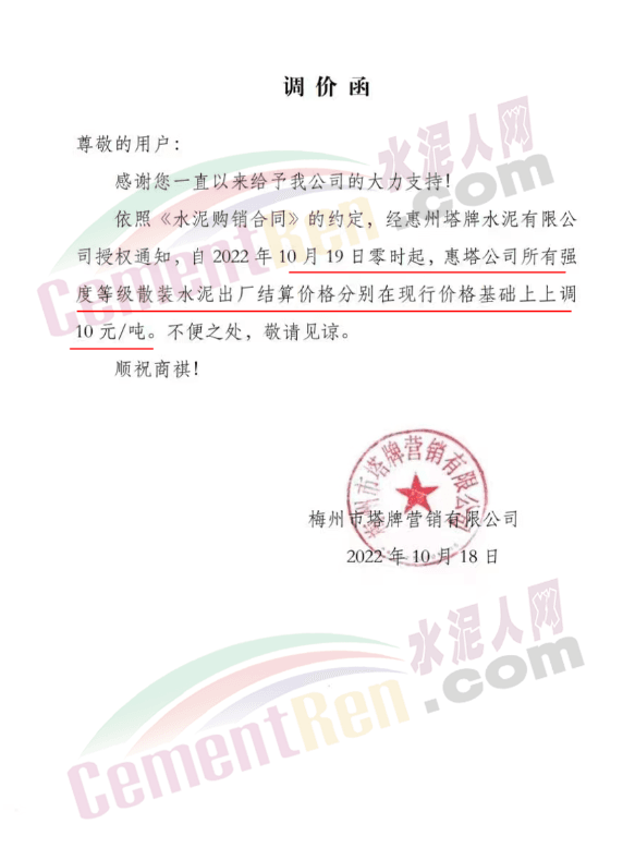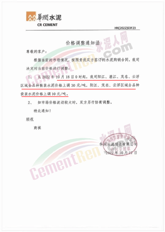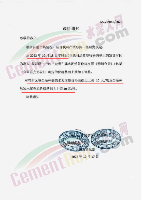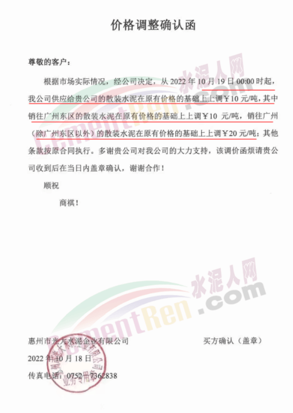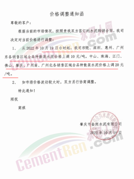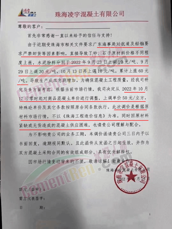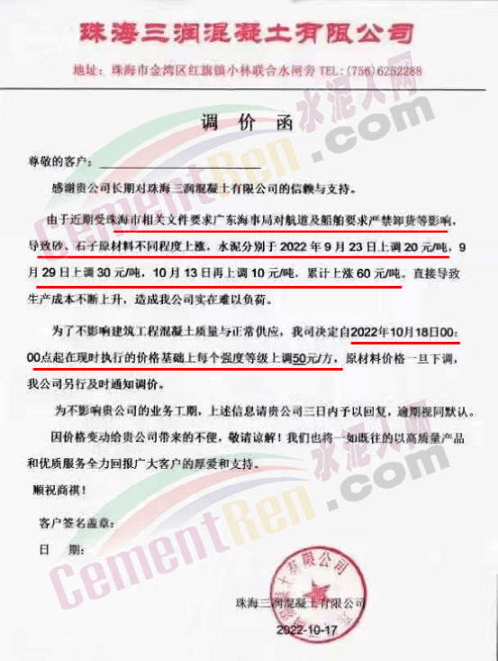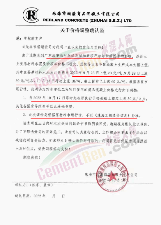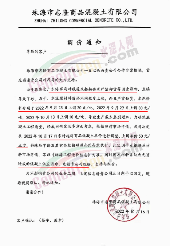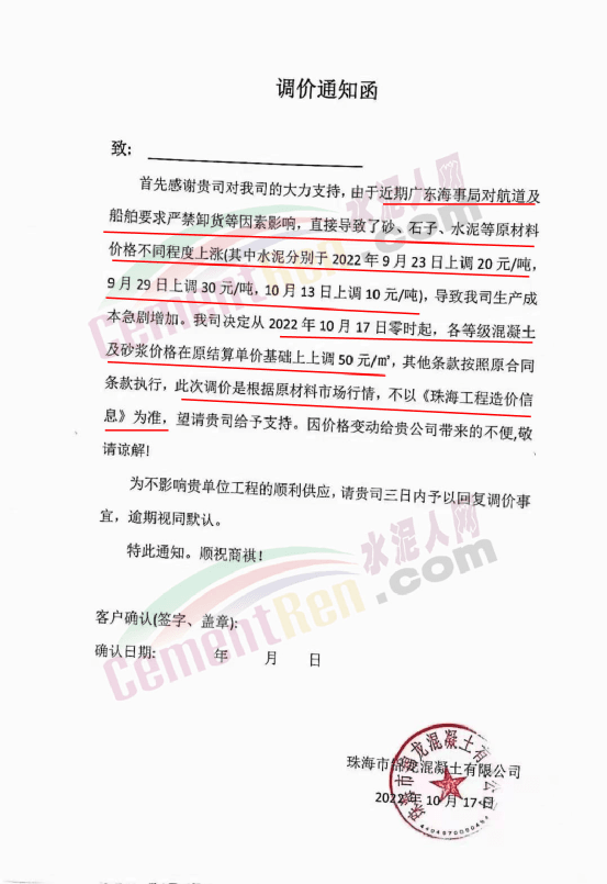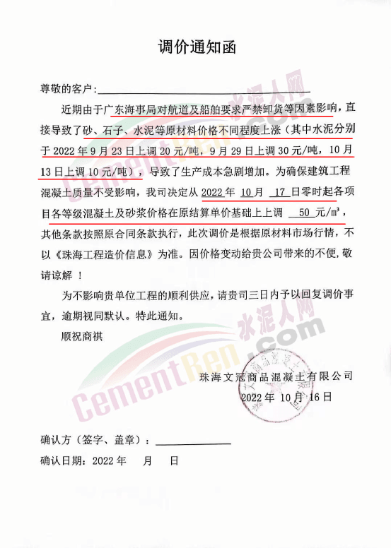 珠海三潤混凝土有限公司、珠海文冠商品混凝土有限公司、珠海市志隆商品混凝土有限公司、珠海市潤濠商品混凝土有限公司、廣東中聯(lián)新材料科技有限公司、珠海市錦龍混凝土有限公司、珠海凌宇混凝土有限公司等近十家混凝土企業(yè)通知稱,由于廣東海事局對航道及船舶要求嚴(yán)禁卸貨等因素影響,直接導(dǎo)致了砂、石子、水泥等原材料價格不同程度上漲。其中水泥分別于2022年9月23日上調(diào)20元/噸,9月29日上調(diào)30元/噸,10月13日上調(diào)10元/噸,累計上調(diào)60元/噸,導(dǎo)致了混凝土生產(chǎn)成本急劇增加。為確保建筑工程混凝土質(zhì)量不受影響,混凝土公司決定各項(xiàng)目各等級混凝土及砂漿價格在原結(jié)算單價基礎(chǔ)上上調(diào)50元/m³。且強(qiáng)調(diào)此次調(diào)價是根據(jù)原材料市場行情,不以《珠海工程造價信息》為準(zhǔn)。同時提到,因原材料緊缺或無貨造成的混凝土供應(yīng)困難,也請客戶理解、支持與配合。