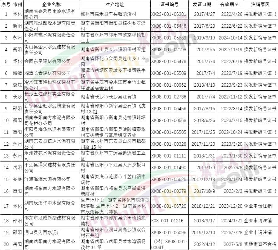 湖南省20家企業(yè)生產(chǎn)許可證注銷,16家水泥企業(yè)換發(fā)新編號(hào)證書,3家企業(yè)申請(qǐng)注銷,1家企業(yè)實(shí)地審查不合格;