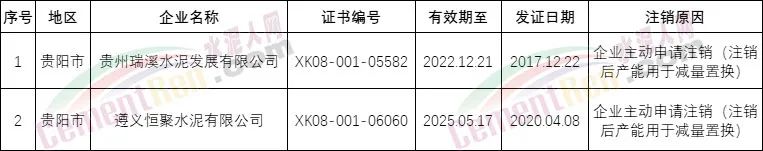 貴州省注銷工業(yè)產(chǎn)品生產(chǎn)許可證2家,均為企業(yè)主動(dòng)申請(qǐng)注銷(注銷后產(chǎn)能用于減量置換);