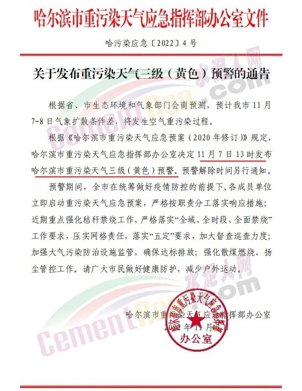 根據(jù)黑龍江省、哈爾濱市生態(tài)環(huán)境和氣象部門會(huì)商預(yù)測(cè),預(yù)計(jì)黑龍江哈爾濱市11月7日至8日氣象擴(kuò)散條件差,將發(fā)生空氣重污染過程。根據(jù)相關(guān)規(guī)定,哈市重污染天氣應(yīng)急指揮部辦公室于11月7日13時(shí)發(fā)布哈市重污染天氣三級(jí)(黃色)預(yù)警。預(yù)警解除時(shí)間另行通知。