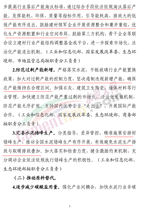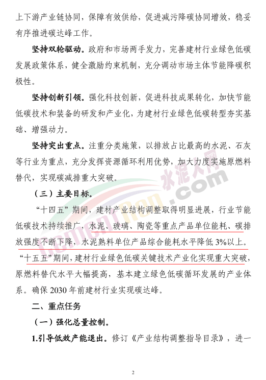 工業(yè)和信息化部、國家發(fā)展和改革委員會、生態(tài)環(huán)境部、住房和城鄉(xiāng)建設(shè)部等四部門聯(lián)合印發(fā)《建材行業(yè)碳達峰實施方案》,方案提出“十四五”期間,建材產(chǎn)業(yè)結(jié)構(gòu)調(diào)整取得明顯進展,行業(yè)節(jié)能低碳技術(shù)持續(xù)推廣,水泥、玻璃、陶瓷等重點產(chǎn)品單位能耗、碳排放強度不斷下降,水泥熟料單位產(chǎn)品綜合能耗水平降低3%以上。“十五五”期間,建材行業(yè)綠色低碳關(guān)鍵技術(shù)產(chǎn)業(yè)化實現(xiàn)重大突破,原燃料替代水平大幅提高,基本建立綠色低碳循環(huán)發(fā)展的產(chǎn)業(yè)體系。確保2030年前建材行業(yè)實現(xiàn)碳達峰。