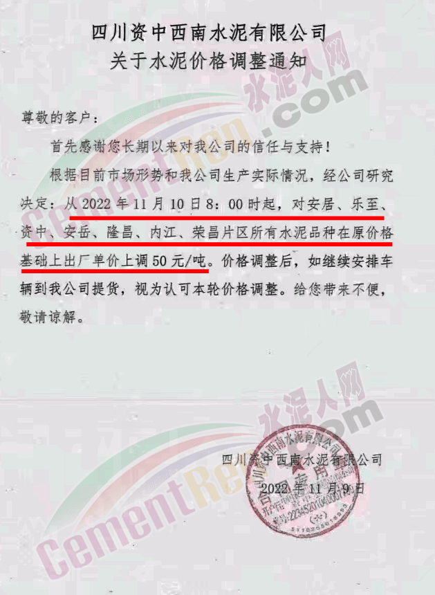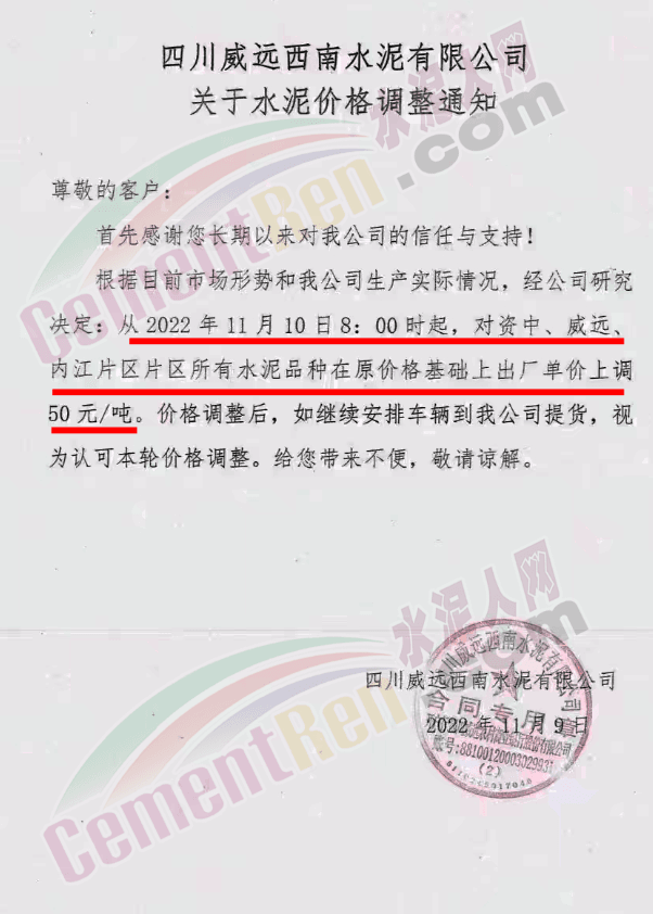 四川威遠(yuǎn)西南水泥通知,11月10日8時起,對資中、威遠(yuǎn)、內(nèi)江片區(qū)所有水泥品種出廠價上調(diào)50元/噸。