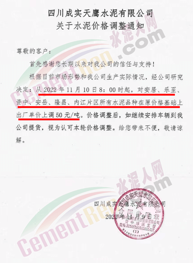 四川成實天鷹水泥有限公司通知,從11月10日8時起,對安居、樂至、資中、安岳、隆昌、內(nèi)江片區(qū)所有水泥品種出廠價上調(diào)50元/噸。