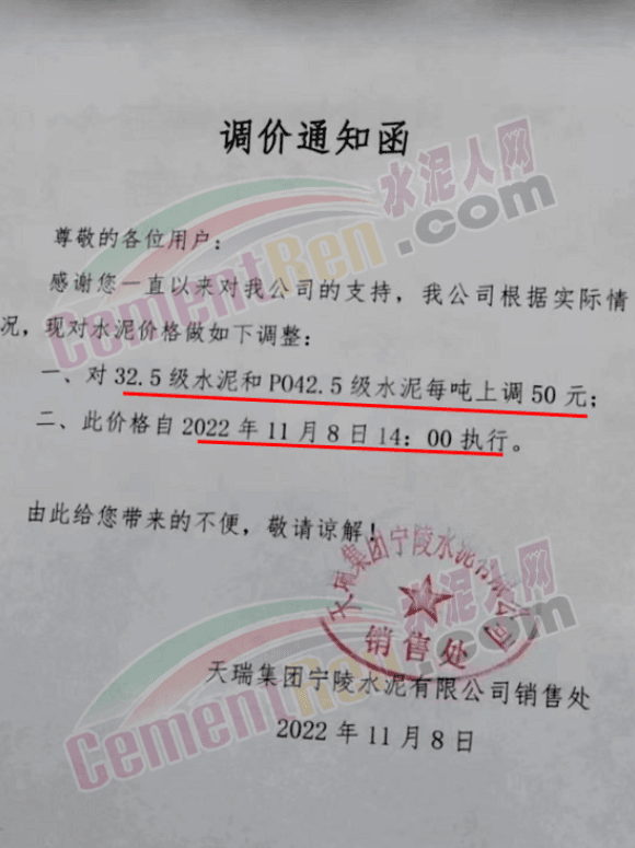 河南天瑞集團(tuán)寧陵水泥有限公司銷售處通知,自11月8日14時起對32.5級水泥和P.O42.5級水泥上調(diào)50元/噸。