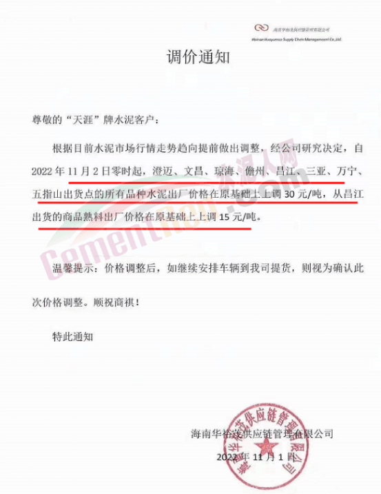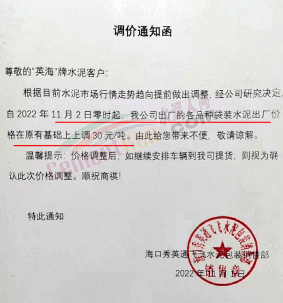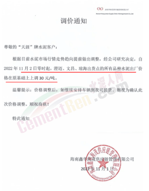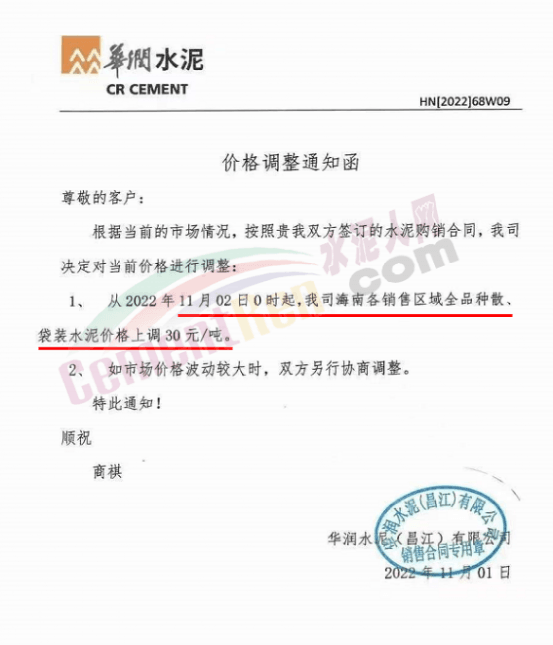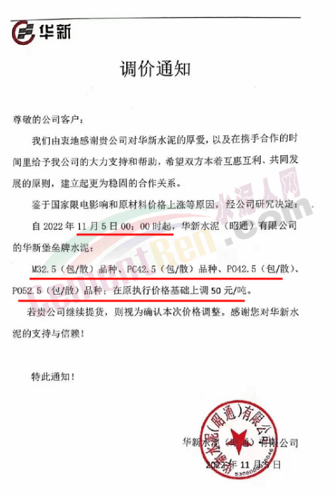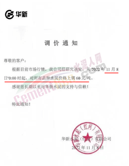 華新水泥(紅河)有限公司通知,11月8日0時起,對所有品種水泥價格上調(diào)60元/噸。