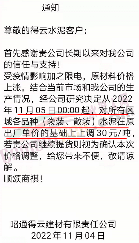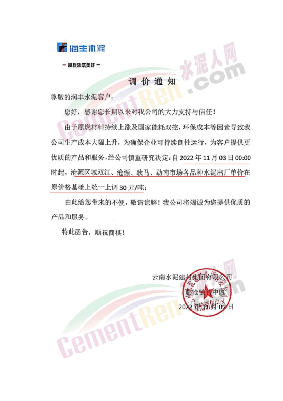 云南水泥建材集團(tuán)有限公司臨滄銷售中心通知,由于原燃材料持續(xù)上漲及國家能耗雙控,環(huán)保成本等因素導(dǎo)致公司生產(chǎn)成本大幅上升,為確保企業(yè)可持續(xù)良性運行,為客戶提供更優(yōu)質(zhì)的產(chǎn)品和服務(wù),經(jīng)公司慎重研究決定,自2022年11月3日0時起,滄源區(qū)域雙江、滄源、耿馬、勐南市場各品種水泥出廠單價在原價格基礎(chǔ)上統(tǒng)一上調(diào)30元/噸。