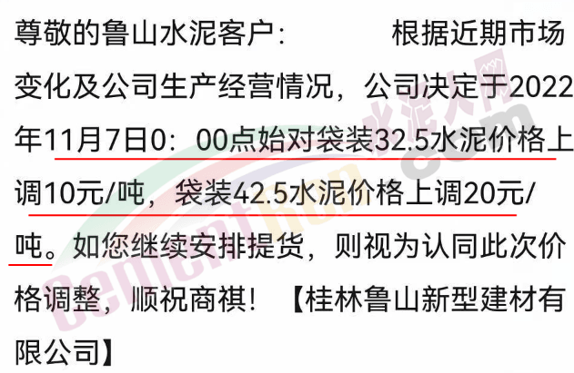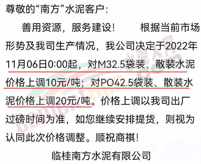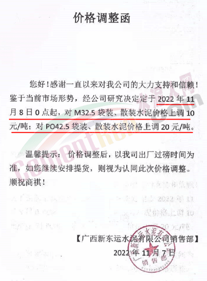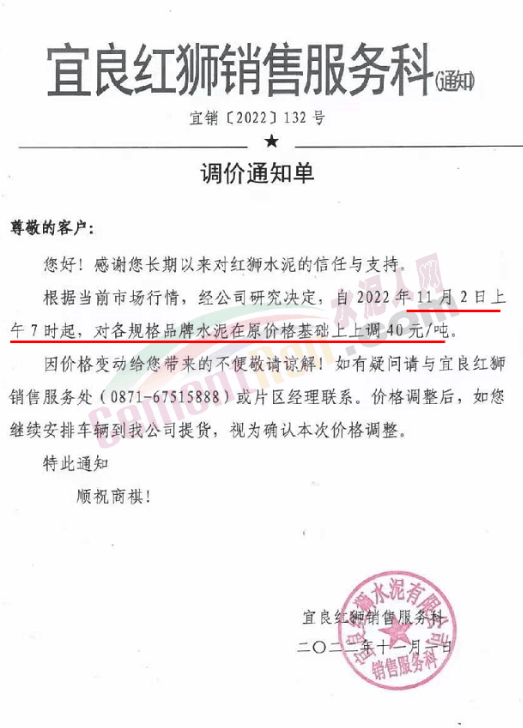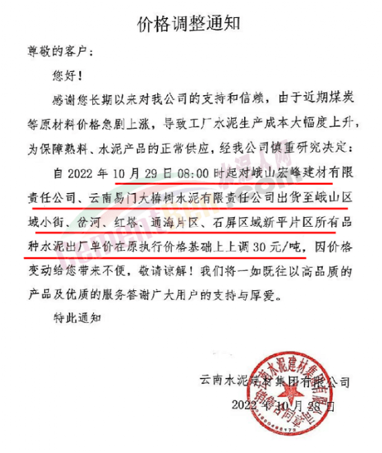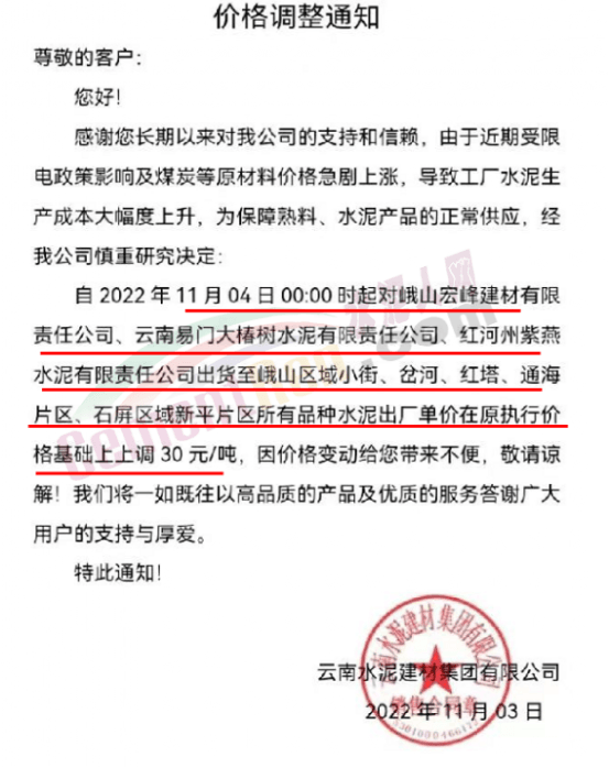 11月2日-3日昆明、楚雄地區(qū)通知上調(diào)水泥價格20-40元/噸;宜良紅獅銷售服務(wù)科通知,根據(jù)當(dāng)前市場行情,經(jīng)公司研究決定,自2022年11月2日上午7時起,對各規(guī)格品牌水泥在原價格基礎(chǔ)上上調(diào)40元/噸。