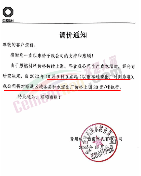 貴州威寧西南水泥有限公司調(diào)價通知稱,由于原燃材料價格持續(xù)上漲,導(dǎo)致公司生產(chǎn)成本增加,經(jīng)研究決定對昭通區(qū)域各品種水泥出廠價格上調(diào)30元/噸。