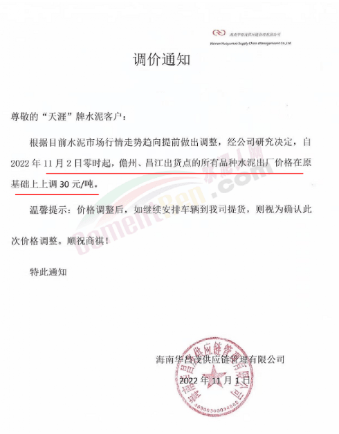 原燃材料價格上漲,企業(yè)生產(chǎn)壓力較大,加之市場需求略有回升,廠家漲價意愿強烈。為提升盈利,11月2日起海南地區(qū)主要品牌企業(yè)通知上調(diào)水泥價格30元/噸。