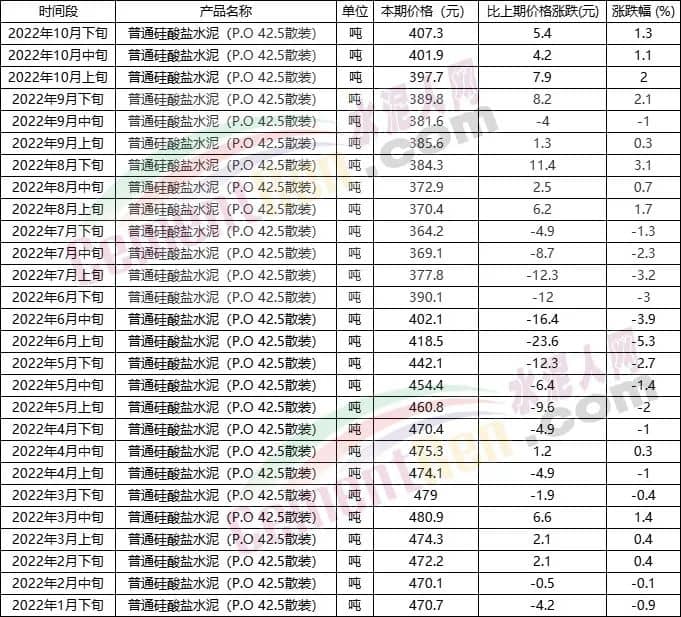 據(jù)國家統(tǒng)計局公布的流通領(lǐng)域市場價格變動情況10月下旬42.5散裝水泥報價407.3元/噸,同比上年同期618.9元/噸仍有211.6元/噸的差距。