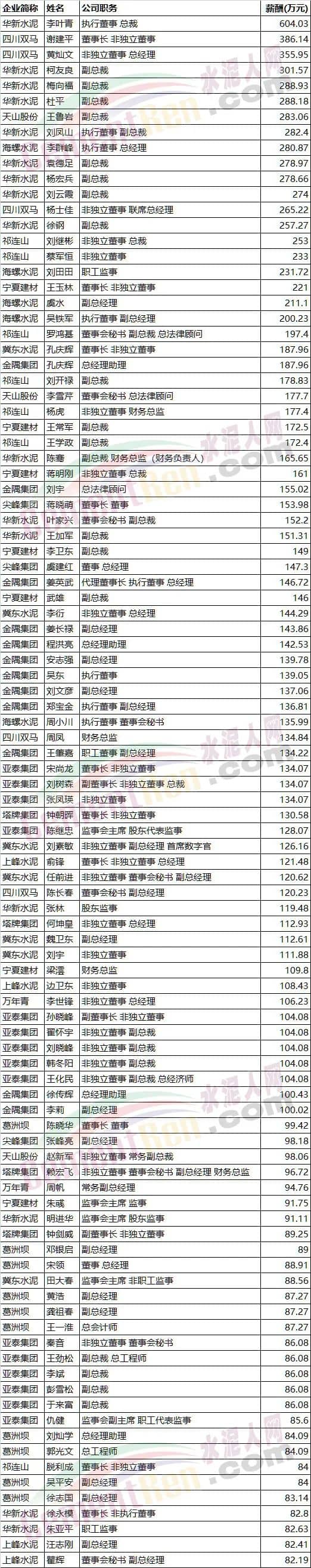 據(jù)不完全統(tǒng)計,A股水泥板塊上市公司高管薪酬前100人排名中,第一位仍是華新水泥總裁李葉青,薪酬為604.03萬元。四川雙馬董事長謝建平位于第二,薪酬為386.14萬元,總經(jīng)理黃燦文位于第三位,薪酬為355.95萬元。