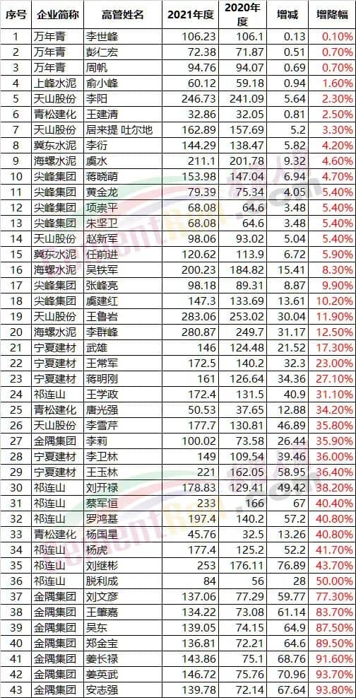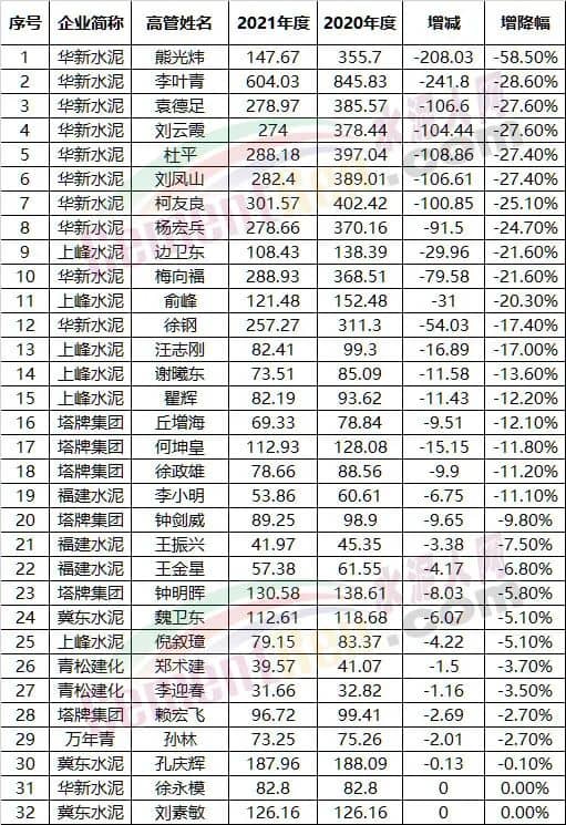 對比2020年,75位水泥上市公司高管中有30位薪酬下降,占比達(dá)40%。其中華新水泥副總裁熊光煒薪酬降幅達(dá)58.5%,總裁李葉青薪酬降幅為28.6%,降幅前11位高管薪酬降幅均在20%以上。