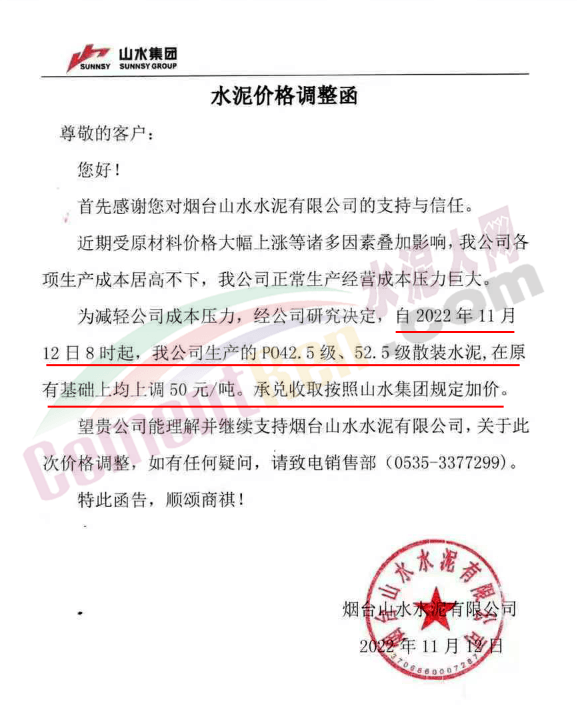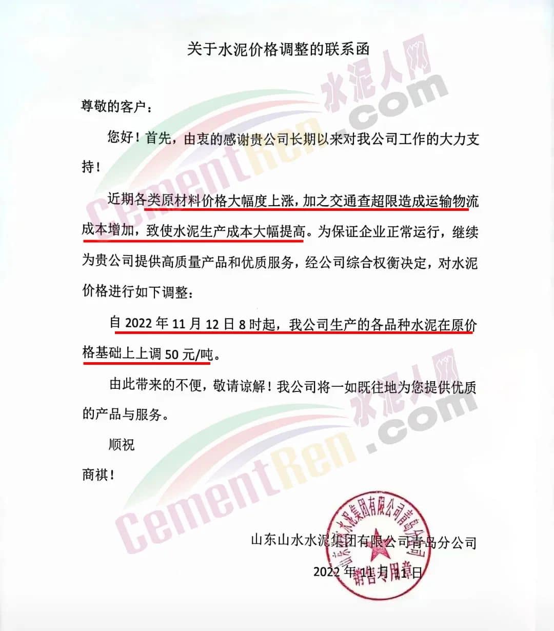 山東省煙臺山水水泥有限公司通知受原材料價格上漲影響,水泥生產成本大幅增加,為保證企業(yè)正常運行。11月12日早8時起,公司生產的所有品種水泥在原價基礎上上調50元/噸。