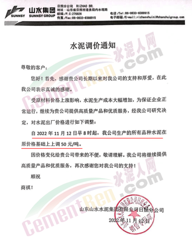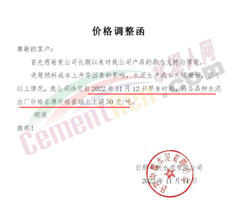 山東日照中聯水泥有限公司通知,受原燃材料成本上升等因素的影響,水泥生產成本大幅增加,鑒于以上情況,公司決定自11月12日早8時起,將各品種水泥出廠價上調50元/噸。